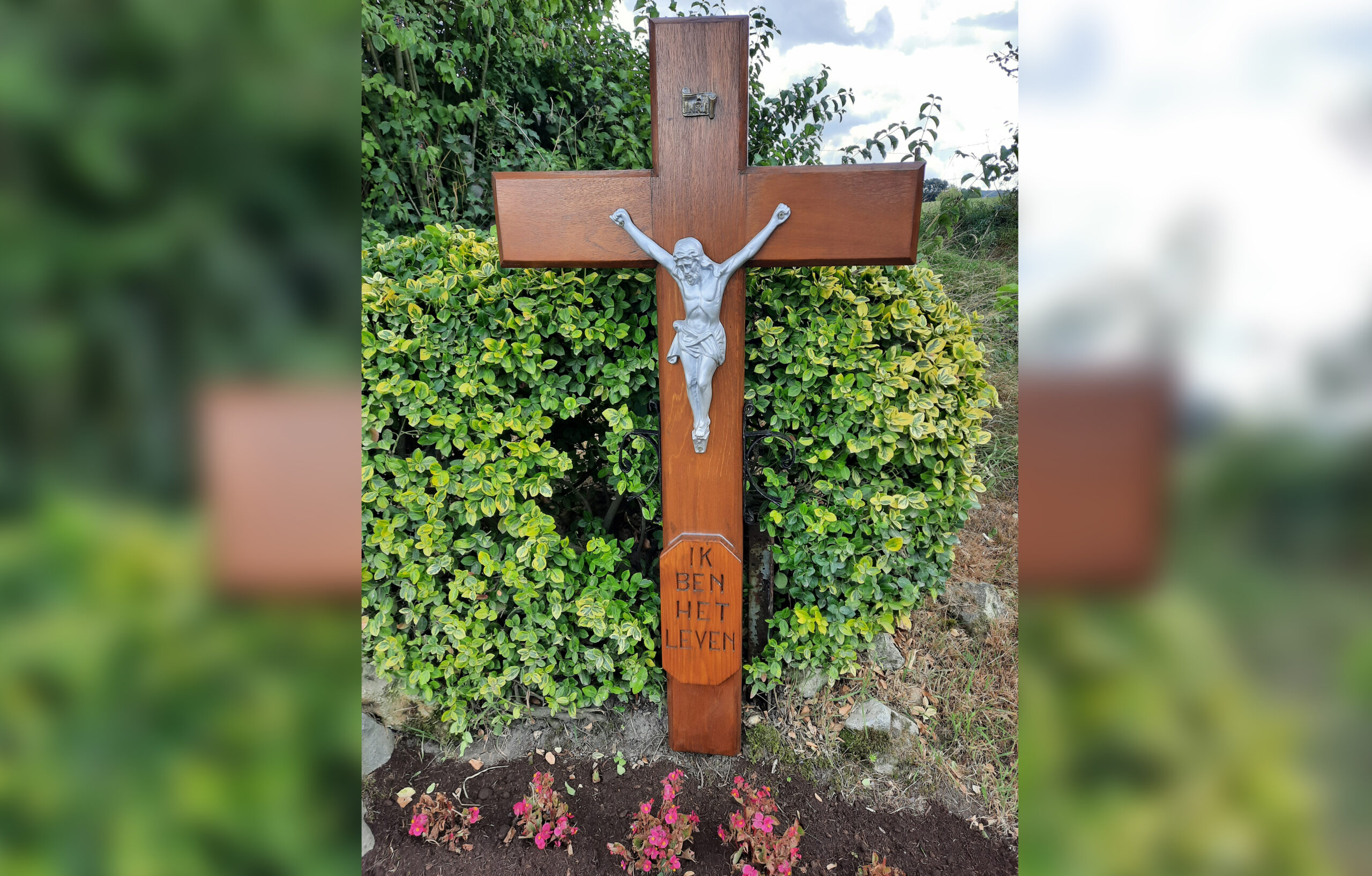 Heel wat jaren geleden stond hier al een wegkruis. Dat werd helaas vernield. Vandaar dat Alfons en Joep Hons er een nieuw wegkruis plaatsten. Een houten kruis dat door Alfons zelf werd gemaakt. Als vakman is hij in staat om mooie kruisen te maken.”